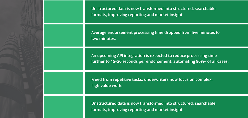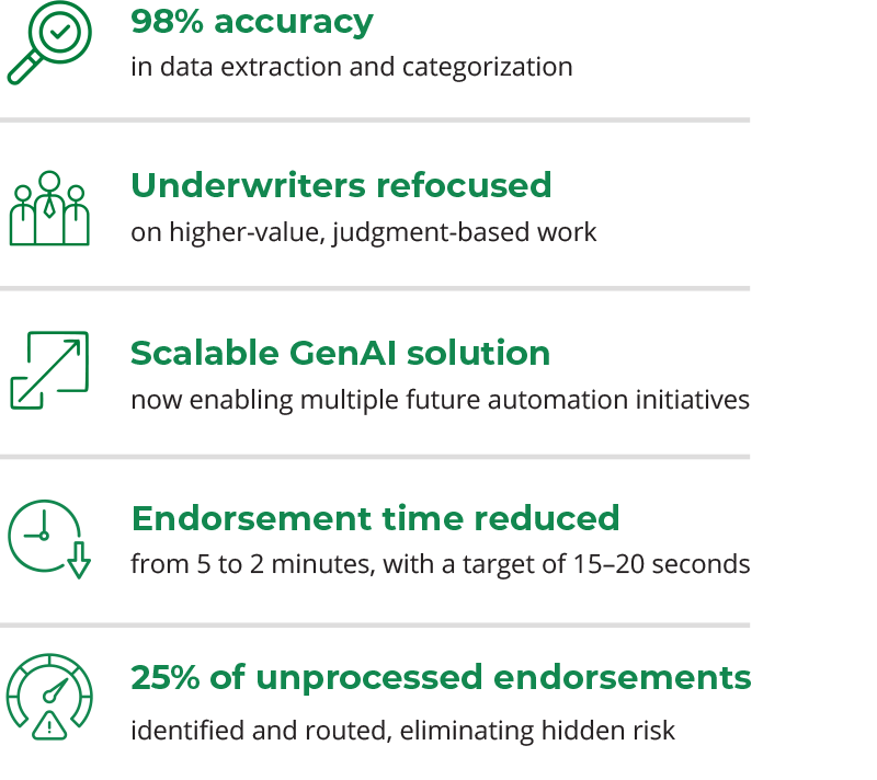 The company’s policy endorsement process—which handles mid-year policy changes—was a critical bottleneck. Each endorsement required brokers and underwriters to interpret complex information, calculate premium adjustments, and manually update downstream systems.