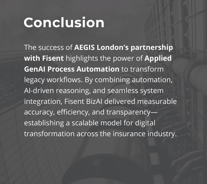 AEGIS London now plans to implement three to four new business processes per year using BizAI, establishing a long- term partnership with Fisent to continuously drive operational efficiency and innovation.