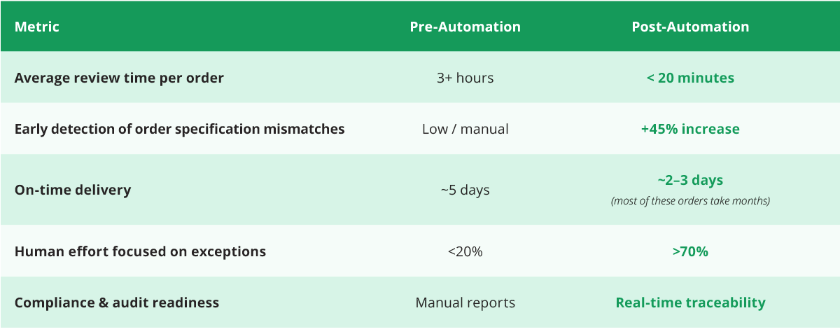 Each request for quote (RFQ) or purchase order (PO) involves complex technical specifications, QA requirements, and regulatory compliance checks. Manual review and validation across procurement, engineering, Quality Assurance, and fulfillment created: