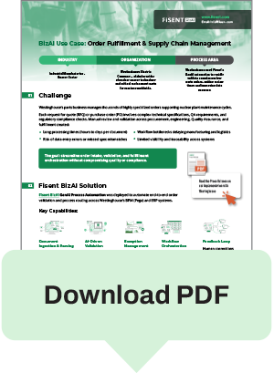 Fisent BizAI GenAI Process Automation was deployed to automate end-to-end order validation and process routing across Westinghouse’s BPM (Pega) and ERP systems.