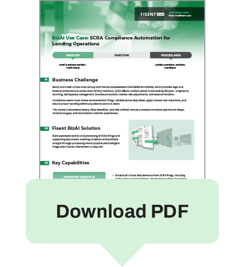 BizAI automates end-to-end processing of SCRA filings and supporting documents, enabling compliant and auditable straight-through-processing where possible and intelligent triage when human intervention is required.