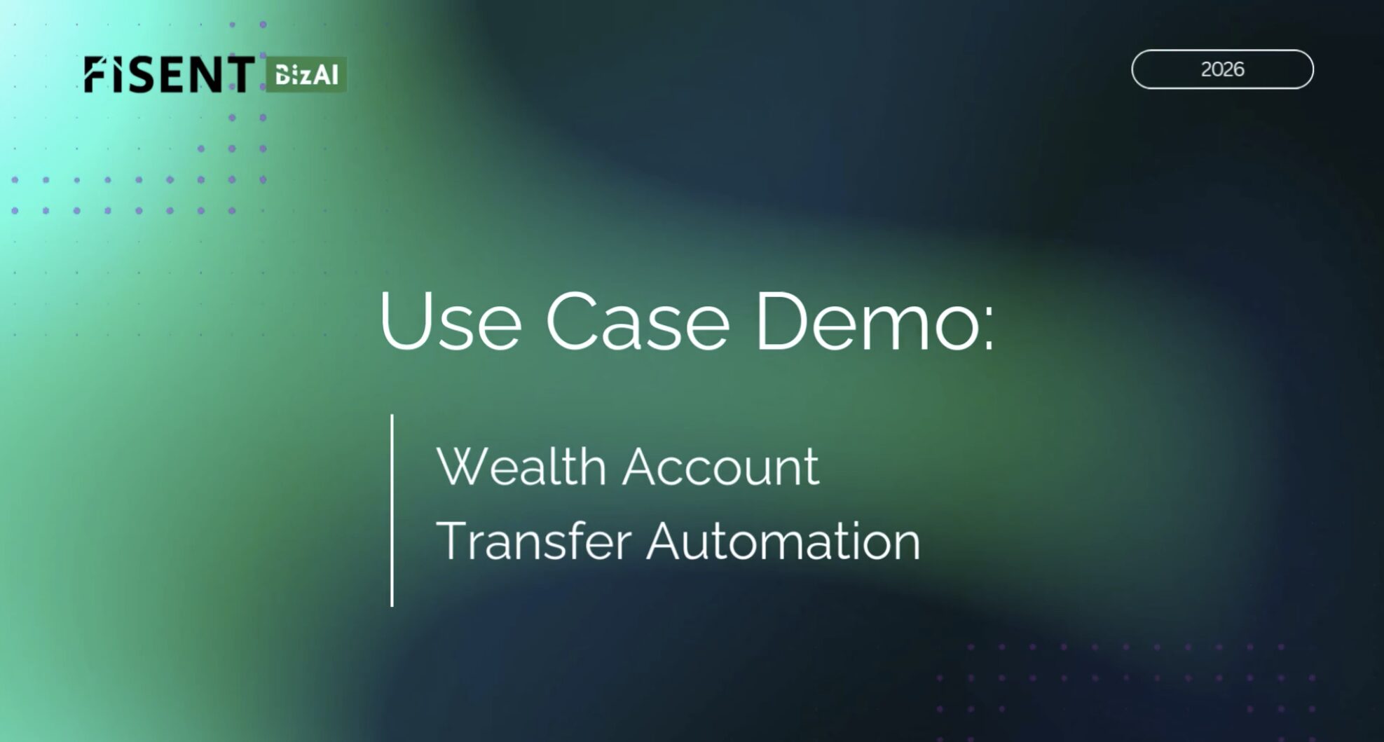 Fisent BizAI can be used to enable the automation of wealth account transfers. In this demo, we showcase the power of BizAI to analyze, validate, and extract unstructured data elements from wealth account statements. Automating aspects of a wealth account transfer can significantly reduce manual time and effort, reduce the risk of costly errors, and improve both customer and employee experience.