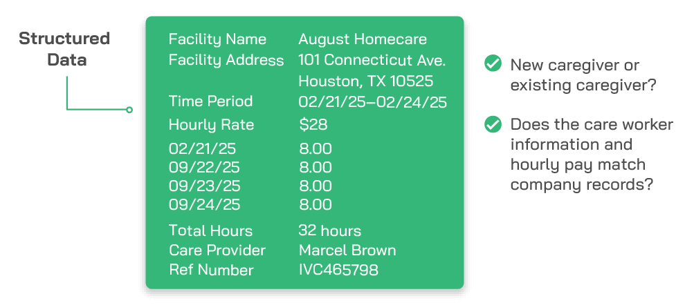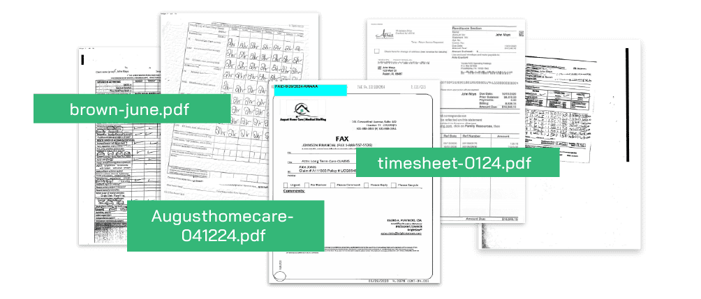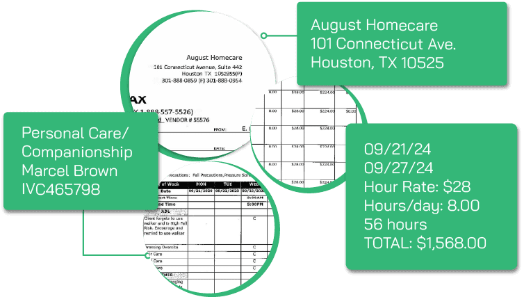 Caregiver invoices submitted for reimbursement include a wide range of services, care codes, and supporting documentation. These invoices are often unstructured — arriving via email, portals, or fax — and contain complex details that must be verified against contract terms, approved care plans, and payer policies.